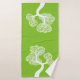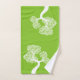White abstract circle tree and name on lime green bath towels set. This lovely, design displays a white abstract tree with circles instead of leaves on all three pieces on green background and a frame with name on the wash cloth. You can remove the name if desired.