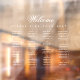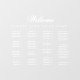 All text is white. The word Welcome is written in an elegant calligraphic script, the rest in caps. The names are ordered alphabetically on 4 columns. Above them and under the word Welcome, there is the message "Please find your seat!".