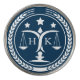 White justice logo with justice scale, laurel wreath on a navy blue background, and custom monogram.