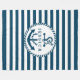 Navy blue and white stripes pattern background featuring nautical anchor 2, and white circle with customizable monogram.