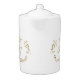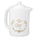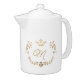 Elegant white tea pot, with a gold tone flourish and crown text area and custom monogram. Personalize the letter to this lovely addition to your dining table.