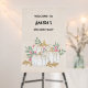 Birthday foam board poster with fancy watercolor white pumpkins with accents of faux gold glitter. Surrounded by green leaves and pink wild flowers.