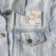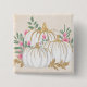 Button with fancy watercolor white pumpkins with accents of faux gold glitter. Surrounded by green leaves and pink wild flowers.
