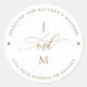 Elegant white and gold wedding sticker, great for envelope seal of favor label. Ability to add any message you like on top and bottom outer rim, great for couple's names and address for envelope seal, or for thank you message and date for favors. Center with couple's initials with "and" in graceful modern hand written calligraphy. Note: typography is not in real foil, but rather print in a golden hue. Part of our "Elegant Calligraphy Minimalist Wedding" collection.