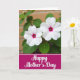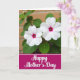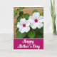 This design shows two white blossoms near the top of the card, their petals softly layered around rich magenta centers that feel like a tender shared glance ❤️. The flowers sit slightly off to one side, giving the scene an easy, intimate balance like a quiet moment between close friends. Behind them, leafy green foliage fades into a gentle blur, with a warm brick-toned background barely visible as if seen through sunlit air. The light is diffused and calm, making the whites look creamy and the magenta tones glow without being harsh. Along the bottom, a wide deep-magenta band stretches across the card like a grounding ribbon beneath the garden view. Centered on that band, the words “Happy Mother’s Day” appear in crisp white lettering, standing out clearly against the dark pink field 🌼. A thin white outline around the lettering adds a neat finish and helps the text pop. The final look is two bright blooms above a deep-magenta strip, with white text centered inside it.
