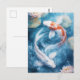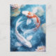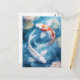 This serene and artistic design features two graceful koi fish shown swimming in a perfect, harmonious circle through a tranquil water garden. One koi is a brilliant, pearlescent white, while the other features bold, vibrant orange patterns across its back, both with long, flowing fins that trail elegantly through the deep blue and teal depths of the pond. Surrounding the swirling fish are large, textured lily pads and delicate white lotus blossoms that float gracefully on the water's surface. Shimmering light particles and soft white bubbles drift through the clear water, creating a peaceful and sophisticated atmosphere of natural balance. The overall aesthetic is clean, painterly, and filled with a sense of quiet Zen beauty, making it an exceptional choice for nature lovers and fans of sophisticated aquatic art. This peaceful koi fish postcard is an ideal choice for sending a thoughtful "thinking of you" message or a quiet note of encouragement to a friend who appreciates the harmony of the natural world. You might choose to use this artistic card for a meditation retreat invitation or as a lovely way to share a message of peace and prosperity with your family during a meaningful life milestone. It also makes a beautiful piece of mini-art for a home office wall or a sophisticated addition to a wellness journal as a small token of aquatic elegance. This versatile design is also an excellent choice for a retirement message, a graduation thank you note, or as a heartwarming way to share a message of joy for any situation or event.