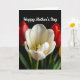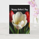 This greeting card features a close-up of a wide-open white flower, its petals softly unfurling with faint pink lines that feel like gentle traces of affection ❤️. At the center, a small cluster of golden-yellow anthers glows warmly, drawing your eye in like a quiet, caring focus. Behind it, blurred crimson blooms and touches of golden blossoms sit against a deep, nearly black background, creating an intimate setting that keeps the main flower in the spotlight. The lighting falls softly across the petals, giving them a velvety look while the green stems below stay crisp and fresh. Near the top of the design, the words “Happy Mother’s Day” appear in white, flowing lettering that stands out clearly against the dark backdrop 🌼. The contrast between the bright petals and the shadowy background adds a cozy, close-up feeling, like leaning in for a tender moment with someone you love. The background remains softly out of focus, with red petals and hints of yellow hovering in a gentle blur behind the central bloom.