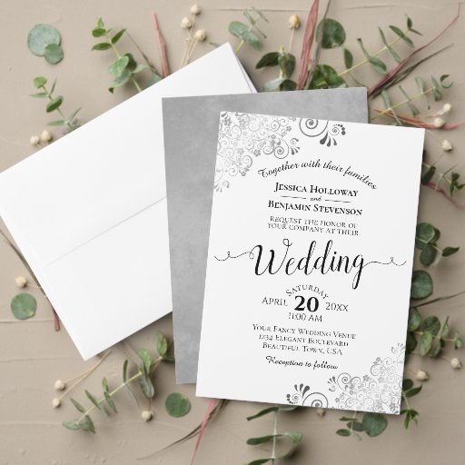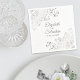 These beautiful napkins will make your wedding reception something special. They feature a simple yet elegant design with gray text on a white background with a lacy silver faux foil curls and swirls in the corners. Easily personalize with your names and the wedding date.