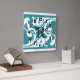 White and Teal Flourish Gold Border Monogram Square Wall Clock