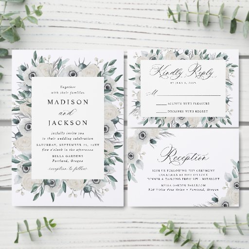 Elegant floral wedding stickers featuring your names encircled by a wreath of white watercolor anemones, ivory roses, and dark sage green leaves. The white anemone stickers are perfect to use for wedding envelope seals and wedding favors. Designed to coordinate with our White Anemones and Roses wedding collection.