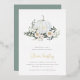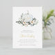 Fall in love with this ethereal botanical design for autumn bridal showers. Elegant design features a white watercolor pumpkin inscribed with the couple's initials and flanked by white flowers, green foliage, and eucalyptus leaves. Gold foil lettering and accent trim completes the design.