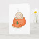 An adorable baby with one curly hair sits inside an orange pumpkin on customizable Halloween T-shirts, magnets, greeting cards, tote bags, and other items that are perfect for baby's first Halloween!