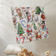 Christmas-themed pattern featuring Santa Claus, reindeer, snowmen, elves, Christmas trees, candy canes, and snowflakes on a white background