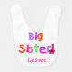 A cute bib for the big sister, we also have the bigger sister, biggest sister, and little sister bibs! Features kid style text of purple, pink, orange, and green on white that reads Big Sister! You can easily add a name to this baby bib to personalize it!