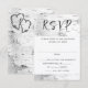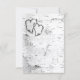 White birch bark wedding RSVP cards. Vertical design with wording that requires guests to include the number in their party attending. This requires the couple marrying to mark the total number invited on each enclosure card. White paper with very dark gray text, and easy to use templates. Realistic white birch background image, which continues onto the back where two hearts are included.