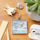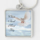 Large square premium metal keychain with an image of a white dove in a cloudy blue sky and the words “White Bird Must Fly” in black script.