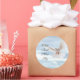 Round sticker to match our "White Bird" invitation with an image of a white dove in a cloudy blue sky and the words “White Bird Must Fly” in black script.