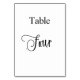 The table number is written with an elegant hand lettered style script. Black letters, white background.