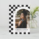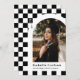 This modern and unique graduation announcement features a white and black checkered background highlighting a photograph of the graduate framed in a white arch with the graduate's name and school beneath. A small gradation cap is cleverly displayed in the checked background with the graduate's graduation year. The back has a fun matching checked pattern in the same white and black.