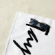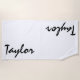 Add a Custom Name or other Text for a Personalized Beach Towel. The towel is white with black script typography.