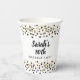 Elegant black and gold confetti glitter on a white 80th birthday party paper cup. Personalized with the name of the guest of honor and her age.