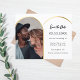 On front: Add your own vertical size photo. A faux gold photo arch frame. A classic white background, black text. Personalize and add your nams and the date.