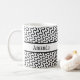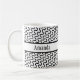 The surface of this mug is covered in a funky, retro white and black pattern with rows of diagonal waves. Through the center is a black-bordered white band. A first name has been added over this band to both sides of the mug. You can add your name where the placeholders appear, write something else, or remove the words altogether. The font can also be changed to another if you like! It's great to play with this design and make it your own. Personalizing and editing is fun!
