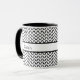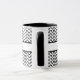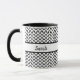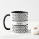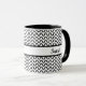 The surface of this mug is covered in a funky, retro white and black pattern with repeating simple, horizontal waves. Through the center is a black-bordered white band. A first name has been added over this band to both sides of the mug. You can add your name where the placeholders appear, write something else, or remove the words altogether. The font can also be changed to another if you like! It's great to play with this design and make it your own. Personalizing and editing is fun!