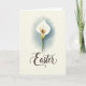 This card features a single white, trumpet-shaped flower with a softly curled edge, painted with gentle blended washes that feel calm and intimate, like a quiet gift between close friends 🌷. A small golden-yellow center peeks out from the bloom, drawing the eye the way a tender glance does. Behind the flower, a misty blue-grey halo fades outward, giving the scene depth without crowding the main image. A thin green stem drops straight down, steady and simple against the creamy off-white background. Near the lower portion of the card, the word “Easter” appears in flowing, calligraphic lettering in dark brown. The text sits centered beneath the stem, leaving plenty of open space around it for a soft, airy look. The overall layout feels balanced and gentle, with the flower standing alone like a thoughtful note left for someone special 🐇. The blue-grey wash forms a loose oval behind the bloom, fading at the edges into the pale background.