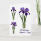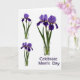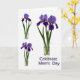 This card shows three arrangements of deep violet flowers set against a bright white background, with two single blooms on the sides and a larger, intertwined pair in the center that leans close like old friends ❤️. The petals are layered in soft curves, and the rich purple tones feel romantic in the way the central blossoms seem to face one another. Each green stem sits in a slim, clear glass vase filled with water, letting you see the submerged stalks and adding a gentle, intimate still-life mood. Bright, even lighting highlights the velvety texture of the petals and makes the purple look lush without overpowering the airy space. Small touches of yellow and creamy white glow at the flower centers, like tiny warm sparks that draw your eye in 🌼. Beneath the main floral grouping, a short celebratory message appears in dark lettering centered near the bottom on the white area. The glass catches faint reflections, and the water line is visible inside each vase under the stems.
