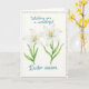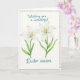 This design shows two white blossoms painted in soft watercolor, each with six gently narrowing petals and a golden-yellow cluster of stamens glowing at the center. The flowers rise on slim green stems with a few muted green leaves, set on a smooth cream background that keeps the focus on their quiet closeness. A gentle, diffused light washes over the petals, giving them a translucent look that feels tender, like a shared glance between close friends. Near the top, a turquoise message is written in flowing cursive-style lettering, standing out clearly without overpowering the flowers. The text sits comfortably above the blooms, leaving open space around it so the layout feels airy and calm. Around the edges, a border of small multicolored polka dots adds a light, festive touch, with colors scattered like confetti 🌷. The overall palette stays soft and springlike, with the warm yellow centers drawing the eye back to the middle 🐰. The polka-dot frame runs along the periphery in evenly spaced dots of varied colors.