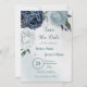 Beautiful botanical save the date card featuring white, dusty blue and navy blue flowers with green leaves.