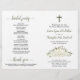 This beautiful program is designed for a Catholic ceremony. It features a rustic boho chic design with a hand painted watercolor roses and blossoms in shades of ivory, white, and cream. There is a crucifix or cross, with elegant sage green or olive colored script calligraphy for the names of the couples and titles. The inside has extended space for all of the details on the ceremony, while the back has information on the bridal party along with a short thank you note. Beautiful way to welcome your guests and make it easy for them to follow along with the ceremony.