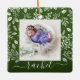 Your favorite photo on white leaves, berries and dots and ANY COLOR background (we show green.) CHANGE the name to anything! TIP: Put your text between the squares to retain the text swashes - upload a high resolution, photo cropped to square shape. This Christmas ornament makes a memorable gift for family and friends or create just for yourself! Double-sided - we show birth announcement on the back, but you can add anything.
