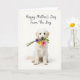 This card shows a cream-colored puppy sitting calmly against a bright white background, its soft coat shaded from near-white on the body to gentle golden tones on the ears. The puppy’s dark, round eyes look straight ahead with a tender, trusting expression that feels like a sweet gesture between close friends ❤️. A small bouquet rests carefully in its mouth, with purple blooms, sunny yellow flowers, light pink petals, and fresh green leaves adding a cheerful contrast. The stems are held lightly, as if the puppy is trying not to crush the flowers while offering them with quiet affection. Near the top, the message “Happy Mother’s Day From The Dog” appears centered in a flowing, dark-colored lettering style that stands out clearly against the white space. A soft hint of shading under the puppy gives the scene a grounded, airy look, like it’s sitting in gentle daylight 🌼. The bouquet’s purple and yellow blossoms sit just below the puppy’s nose, with small green sprigs fanning outward.