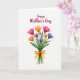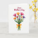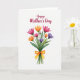 Designed with a bright bouquet of watercolor-style flowers on a white background, the card feels like a gentle gift offered with care ❤️. A clustered arrangement of mixed blooms sits in the center, with soft, see-through paint layers that let the colors blend naturally. Rich fuchsia and warm orange flowers mingle with lavender and deep purple blossoms, each petal shaded slightly differently for a tender, lived-in look. Slender green stems and curved leaves trail downward, gathered neatly at the base as if someone just placed them in your hands. A golden-orange ribbon wraps the stems and forms a tidy bow, adding a sweet, thoughtful touch 🌼. Near the top, the text “Happy Mother’s Day” is placed above the bouquet in deep crimson lettering that curves smoothly across the open space. The generous white space frames everything so the colors and message stand out clearly, with the bow’s loops and ribbon tails resting just below the flower heads.