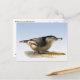 This postcard features the White-breasted Nuthatch, an adorable little bird who climbs up and down tree trunks like a miniature woodpecker foraging for insects. He seems very pleased to have just found the perfect seed! He is a stocky bird, with a large head, short tail, powerful bill and strong feet. The upperparts are pale blue-gray, and the face and underparts are white. He has a black cap. The nuthatch is a noisy species with a wide range of vocalizations.