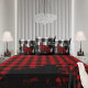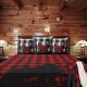 A White and black buffalo plaid winter decor pillow featuring a red bufaflo plaid bear in a quiet woodland pine tree forest, with a white and black buffalo plaid background.