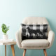 A white and black buffalo plaid winter decor pillow featuring a black silhouette of a red fox in a quiet woodland pine tree forest, with a white and black buffalo plaid background.