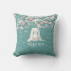 Adorable personalized throw pillow in pink and teal with a white bunny sitting under flowers that rain petals down over it.