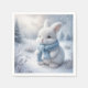 A fluffy white rabbit wearing a blue scarf sits in a snowy winter wonderland, surrounded by frost-covered plants and evergreen trees.