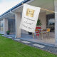 White business logo name opening hours house flag
