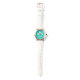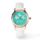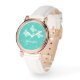 This watch features three beautiful white butterflies on a turquoise background color. There is also a customizable text area for a name and the clock face is made of stylish white lines.