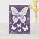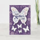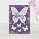 This greeting card shows a celebratory illustration in layered purples with soft, tender accents that feel like a gentle embrace ❤️. At the center, a large white butterfly spreads its wings, creating a bright focal point against the deep violet background. The message “Happy Mother’s Day” sits across the butterfly’s wings in deep blue, flowing lettering, with tiny flower and star-like details in pink and light blue tucked around the words. Delicate curved patterns in beige, rose, and muted blue decorate the wings, adding a calm, caring touch like a quiet smile shared between loved ones. Four smaller white butterflies float nearby, their placement suggesting closeness and connection as they drift together in the open space 🌼. Behind them, lighter purple floral and leafy motifs appear within the darker purple field, giving the scene a garden-like setting. Subtle shadows under the smaller butterflies and the pale patterning across the background add depth, while the crisp white wings stand out sharply against the violet tones. The large butterfly is centered, with the smaller butterflies spaced around it and faint, textured floral shapes filling the backdrop.