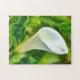 My original artwork is featured on this art puzzle, featuring my original photograph of a white Calla Lily flower in a garden styled with an impressionist watercolor painterly technique for an artsy appearance.