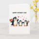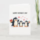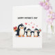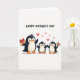 This card shows three rounded, flightless bird characters on a white background, arranged in a gentle arc that feels close and affectionate ❤️. On the left, the largest bird leans slightly toward the others, offering a small gift wrapped in tan paper with a red ribbon, as if sharing a quiet, caring moment. To the right, one smaller bird holds a bouquet of soft pink roses with green leaves, angled upward like it’s presenting them with a shy, friendly pride 🌼. Beside it, the tiniest bird reaches a little flipper toward its companion, their touch suggesting an easy bond and shared excitement. The birds are shaded in charcoal and white with rosy cheeks, bright eyes, and orange beaks and feet, giving them a gentle, welcoming look. Above the characters, the words “HAPPY MOTHER’S DAY” sit centered near the top in large, friendly letters, set in a dark tone that stands out clearly against the white space. Small red and pale pink hearts float above their heads, scattered lightly across the upper area of the design.