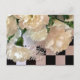 Artistic photo POSTCARD for all occasions: Bright checkerboard in black and white sets off the fluttery beauty of the white carnation / dianthus, with vintage lace textile. Original design and photography by Diane Heller ©dianeheller2019. Reminds us of the racing checkered world "starter flag"!