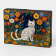 A captivating painting of a white cat with soft fur sitting in a field full of vibrant flowers. The orange, blue, and yellow blossoms sway gracefully around the cat, creating a striking contrast with its white coat. The cat's calm expression exudes peace and tranquility, while the background, filled with blooms, evokes a sense of life and joy.