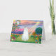 An angel appears in the clouds as the sun breaks through and a rainbow brightens up the sky as a white American Short Haired cat sits in the cool grass.