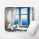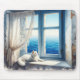 White Cat On a Windowsill With Ocean View Mouse Pad